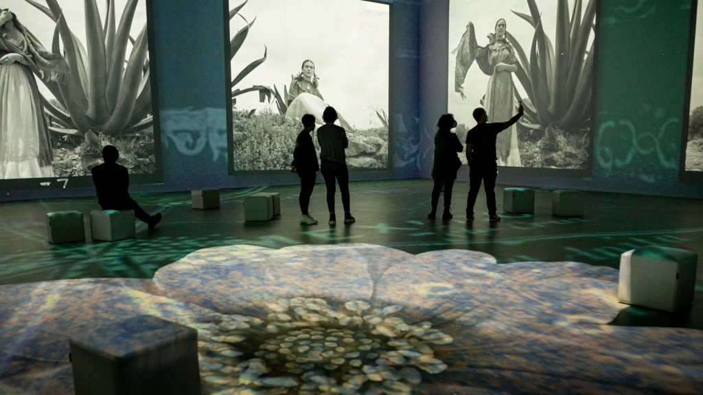 ΑΙΘΟΥΣΑ ΕΜΒΥΘΙΣΗΣ/IMMERSIVE EXPERIENCE: Η θεαματική οπτικοακουστική αφήγηση παρουσιάζει τα γεγονότα και τις εμπειρίες που ανέδειξαν τη μοναδική ζωή της Φρίντα Κάλο και συνέβαλαν στη διαμόρφωσή της ως παγκόσμιου πολιτιστικού συμβόλου, μέσα από προβολές συνολικής επιφάνειας 500 τ.μ. με τη συνοδεία της μαγικής μουσικής του Ραφέλ Πλάνα (περιλαμβάνονται φωτογραφικό αρχειακό υλικό, ιστορικά ντοκουμέντα και απεικονίσεις χώρων που σημάδεψαν την προσωπική και ιστορική της διαδρομή)